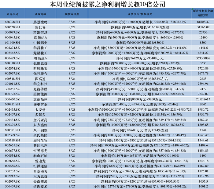 本周还有至少257家公司预计2021年上半年业绩增长一倍以上。其中,业绩预增10倍的公司有33家,更有4家公司预计增长幅度超100倍,分别为热景生物(688068.SH)、新世界(600628.SH)、精准信息(300099.SZ)、深纺织A(000045.SZ)。