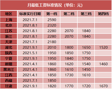 北京与江苏也于8月1日起正式上调最低工资标准。此外,下半年还有上海、天津与西藏三地上调最低工资标准,已于7月1日生效。