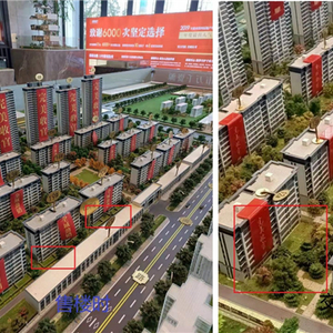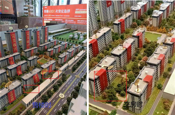 记者对比王峰提供的山河境沙盘照发现,售楼时沙盘每栋楼前有四个院子。而2021年6月接房的时候,该沙盘的院子却消失。