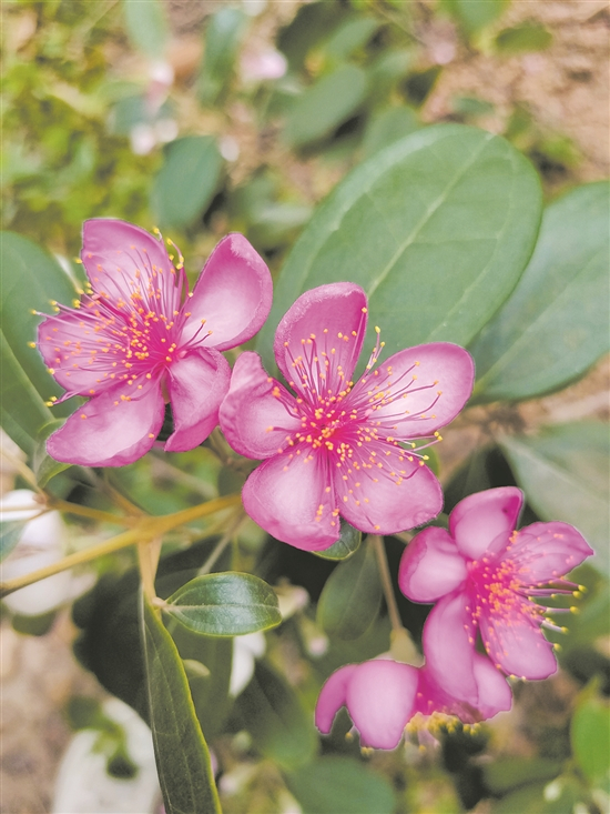 桃金娘是桃金娘科常绿灌木。由于树形紧凑,四季常青,花期长久,花色艳丽多变,花繁果密与绿叶相映成趣,它也成为我国亚热带至热带地区的优良“乡土树种”。