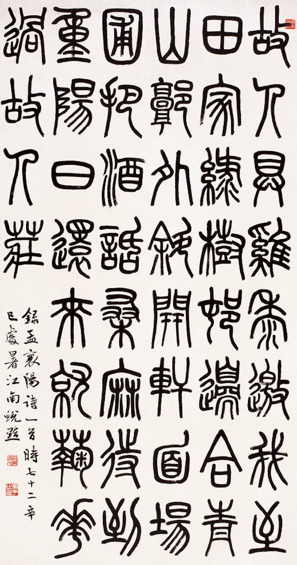 。按理说,萧应该算是晚辈,不应该口出狂言。事实上,存在“口是心非”的一面,萧的篆书取法吴昌硕,从他的孟浩然《过故人庄》作品可一眼辨识。处暑时节,写“待到重阳日,还来就菊花”这样的句子,比较应景。全幅基本是用圆笔,笔法较直接,流丽畅达,结构少变化,俊挺敦厚,个人风格显著。萧退庵平生主张书贵自然,以造作为书家大忌。这一理念明显地体现在他的篆书创作中,认为吴昌硕将字形左右错位有伤蕴藉,也算是批判地吸收吧。萧退庵以篆书名扬大江南北,做到“上窥周、秦、汉代金石遗文,能融大小二篆为一”,说到根子,面对吴昌硕,内心不服气,似有“崔颢题诗在上头”的遗憾。