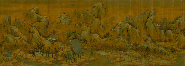 如果说《池塘秋晚图》是从小处入手,以小见大,一叶知秋,领略到秋意况味。同为赵氏宗族的赵伯驹《江山秋色图》堪称大手笔,得以窥见山光水色,江山如画。此作为青绿设色。画中有青山碧水、殿宇村舍,栈道、桥梁穿插其间,又有苍松翠柏,茂林修竹,移步换景,令人玩味不尽。山石用小斧劈皴法,再施以青绿重色,树木、建筑刻画细腻精谨,点景人物描绘细致入微。刻画精细而不琐碎,带有宋代画院气派,是标准的“精工之极,又有士气”风格。