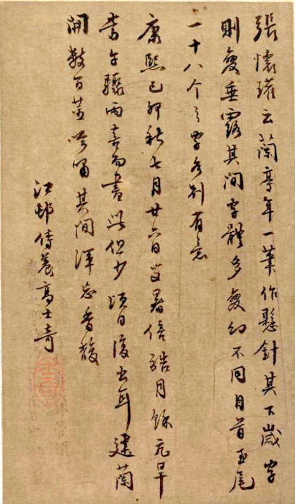 “康熙已卯秋七月廿六日,处暑倍酷,月余亢旱,当午骤雨,喜而书此,但少倾日复书耳。建兰开数百茎,吟啸其间,浑忘香馥。”