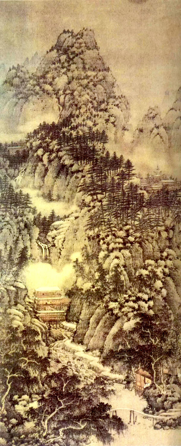 。画中之山,乃典型的江南丘陵,土复石隐,圆浑厚实。山顶多“矾头”,坡石用长、短披麻皴描绘,不求奇峭而显得平和凝重。山体用淡墨烘染,于山石之凹处以浓墨、焦墨点苔,以显现江南山水之湿润郁秀、生机流荡。笔性温和,不装巧趣。这就是巨然创造出来的用以描绘“淡墨轻岚”的江南山水的一整套“皴、擦、点、染”的技法。身在山林,穿梭于其间,“行走”、“云游”加上“问道”,“只在此山中”,不过问世事,何等逍遥!