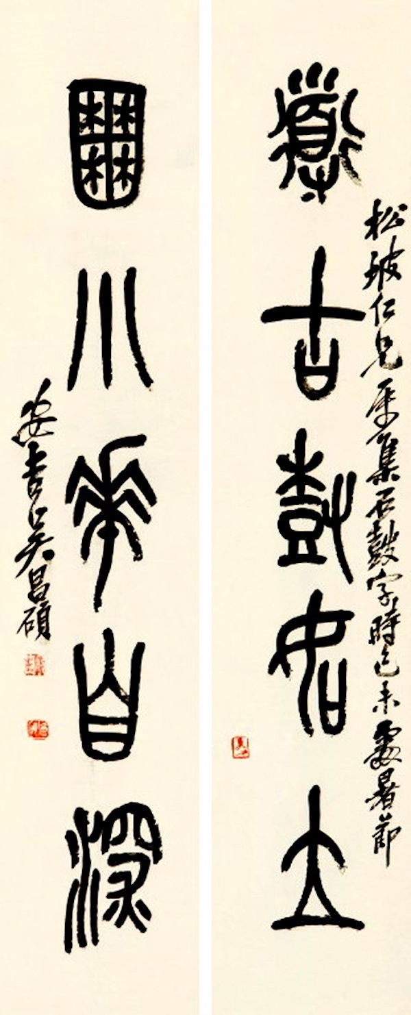 1919年的另一个处暑时节,吴昌硕作篆书联“道(导)古树如立,囿(圃)小花自深。”这是所有喜爱吴昌硕篆书之人所熟悉的风格。貌似石鼓,但其体势已变,笔法的烂漫恣肆,体势的左低右高,将石鼓文正方结体改造为纵长之势,于拙朴古貌中显出新气象。