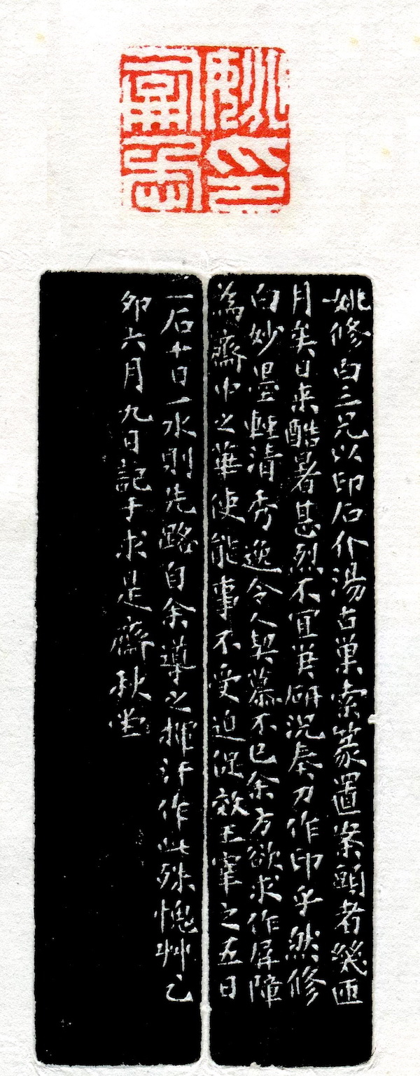 “姚修白三兄以印石介汤古巢索篆,置案头几匝月矣。日来酷暑甚烈,不宜笔研(砚),况奏刀作印乎!然修白妙墨轻清秀逸,令人契慕不已。余方欲求作屏障,为斋中之华使。能事不受迫促,效王宰之‘五日一石,十日一水’,则先路自余导之。挥汗作此,殊愧草草。”
