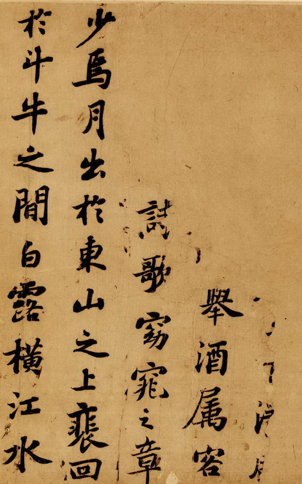 宋神宗元丰五年(1082)七月十六日,苏轼时年四十八岁,与友人乘舟游览黄州城外赤鼻矶,遥想八百多年前,三国时代孙权破曹军的赤壁之战,故作《赤壁赋》,表达对宇宙及人生的看法。苏子情驰神纵、超逸优游的心神于其中可见,成就千古名篇,书文合一。此卷用笔锋正而劲健,力透纸背,结字矮扁而紧密,力量凝聚收敛在筋骨中,可谓纯绵裹铁,全篇笔墨丰润沉厚,有一种静穆深远的气息,乃中年时期少见的用意之作。不过依据书写习惯来推测,当不是首稿,而是抄稿,也就是定稿作品,否则不会如此整洁。如果第一次的手稿可以留存,相比会更见趣味。开篇第一句是:“壬戌之秋,七月既望”,“望”即“望日”,指阴历的每月十五。七月十五乃是中元节。“既望”在后一天,也就是阴历十六,说明苏轼是在中元节后一天到达赤壁的。2021庚子年七月既望,正好是处暑节气的正日。日月如梭,苏轼这名篇流传已近千年。当年他所感慨的依然是我们所感喟的: