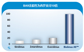 BA9(优美莫司Biolimus A9,简称BA9)是蓝帆医疗旗下柏盛国际的全球独家专利药物。使用BA9的冠脉支架产品,曾多次登顶新英格兰、柳叶刀等国际顶级医学杂志,安全性和有效性得到全球的广泛认可。BA9的高亲脂性是雷帕霉素、佐他莫司、依维莫司等莫司类药物的10倍,解决了药物组织吸收效率低,组织内停留时间短的问题。 蓝帆医疗对BA9做了进一步工艺革新,不同于作用机理为细胞毒性且在临床疗效上极具争议性紫杉醇药物,也不同于普通雷帕霉素存在亲水性较强在输送过程中易丢失、在病变处吸收慢,半衰期仅62小时作用时间短等显著劣势,BA9作为雷帕霉素的衍生物拥有比普通雷帕霉素高10倍的亲脂性,可以减少在输送过程中的流失、加速在病变处的吸收,并且拥有长达20天的组织半衰期,是涂层药物的优选。