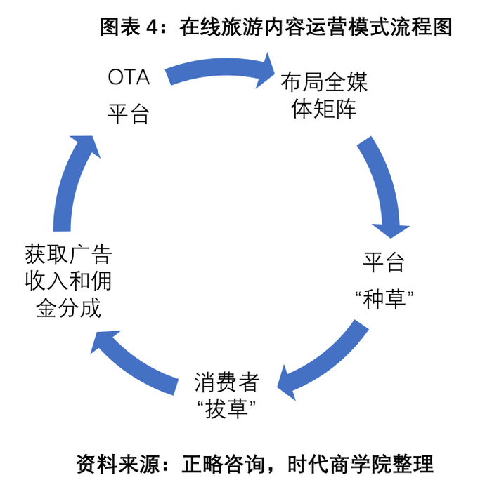 内容运营模式就是媒体化商业模式,通过内容分享、社交分享等聚集大量的目标人群流量,成为在线旅游市场的信息共享入口,进而形成聚集效应。在聚集效应下通过广告展示、内容植入等方式形成一种旅游服务企业品牌或服务的广而告之,是一种媒体化玩法,因此广告收入和佣金分成便成为其主要盈利模式。