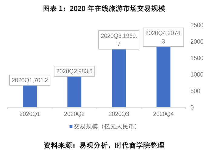 2020年下半年起,在线旅游市场步入有序复苏阶段,第三季度在线旅游市场交易规模环比增长100.3%,随着疫情形势好转以及国内旅游出行需求恢复,市场回暖态势明朗。