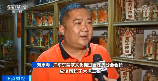 广东东莞茶文化促进会陈皮分会会长刘康寿:2020年比2019年销量增长了大概三倍,2021年比2020年销量也是增长了差不多三倍。