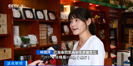 广东东莞某商家陈皮销售员林晓萍:因为稀缺性,年份越久越少,十五年份的陈皮,2019年价格是800元每斤,现在已经卖到每斤1600元。二十年份的陈皮在2019年卖2000元每斤,现在已经卖3000元了。