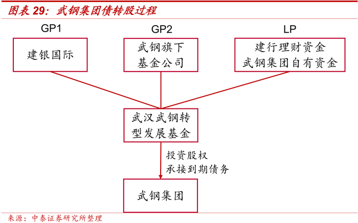 2016年10月,武汉钢铁(集团)公司与建设银行共同设立武汉武钢转型发展基金,是我国首单落地的央企市场化债转股项目。基金分两阶段设立,总规模240亿元,由建行子公司建银国际与武钢旗下基金公司作为双GP,建行理财资金和武钢集团自有资金作为LP,基金资金主要用于直接投资武钢集团子公司股权和承接武钢集团到期债务。