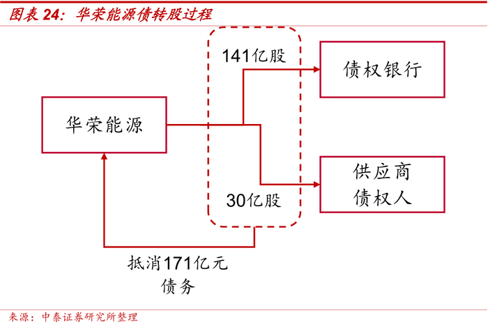 2016年3月,华荣能源通过向债权人发行171亿股股票,其中向22家债权银行发行141亿股,向1000家供应商债权人发行30亿股,以抵消171亿元的债务,其中华荣能源通过向最大债权方中国银行发行27.50亿股股票1:1抵消了总额63.10亿元债务中的27.50亿元。