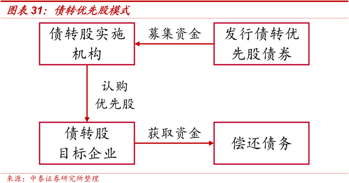债转优先股主要指债转股实施机构将目标企业的债权转化为优先股的模式,是新一轮市场化债转股的创新模式。债转股实施机构通过债转优先股债券等方式募集资金,直接用于认购目标企业发行的优先股,在拓展债转股资金来源同时极大降低了权益投资的成本。此外,优先股相较债券收益相对更高,且条款更灵活,能够有效减轻企业的债务负担。