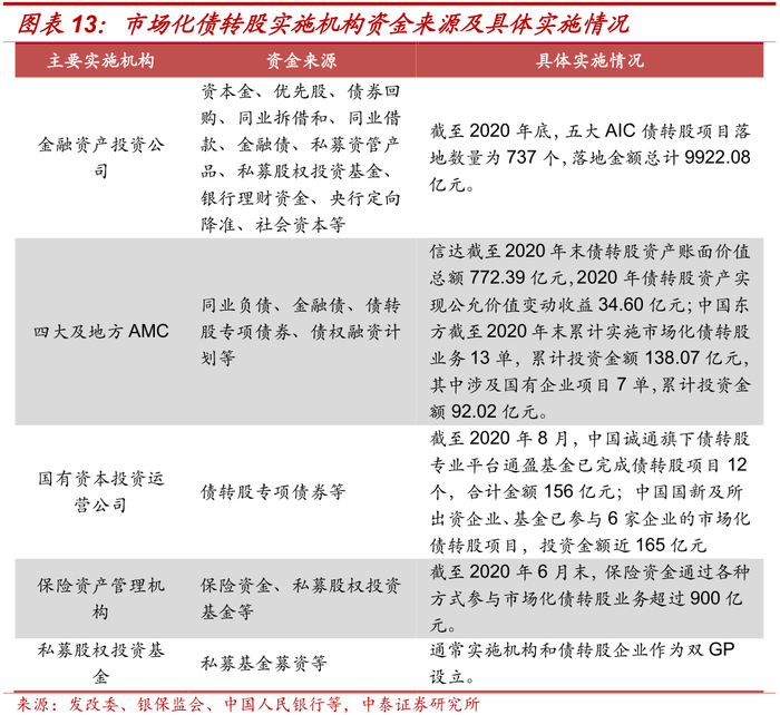 目前主要的债转股实施机构包括金融资产投资公司、四大及地方AMC、国有资本投资运营公司、保险资产管理机构和私募股权投资基金等,主要以资本金、优先股、金融债、私募基金募资等方式获取资金进而实施市场化债转股。