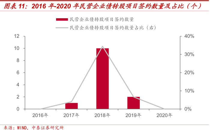 近年来随着政策对民营企业实施债转股的支持,民营企业债转股项目签约数量也逐步提高。根据本文统计的债转股案例,2016年-2020年,除2016年和2020年无民营企业进行债转股外,2017年-2019年民营企业债转股项目签约数量分别为1个、10个和2个,占比分别为4.00%、34.48%和6.67%。