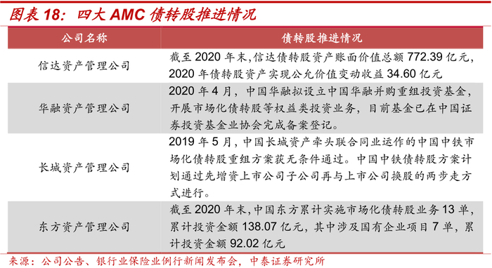 2004年,财政部发布的《金融资产管理公司有关业务风险管理办法》(财金〔2004〕40号),标志着四大AMC业务逐渐由政策化转向商业化、市场化[7]。由于在上一轮政策性债转股过程中积攒了较多经验,在市场化债转股中,四大AMC也发挥着积极作用,其中信达截至2020年末债转股资产账面价值总额772.39亿元,2020年债转股资产实现公允价值变动收益34.60亿元;中国东方截至2020年末累计实施市场化债转股业务13单,累计投资金额138.07亿元,其中涉及国有企业项目7单,累计投资金额92.02亿元。