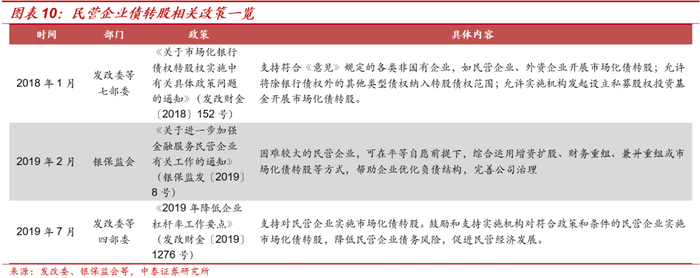 2018年1月,《关于市场化银行债权转股权实施中有关具体政策问题的通知》(发改财金〔2018〕152号)提出鼓励民营企业、外资企业开展市场化债转股[2];2019年2月,《关于进一步加强金融服务民营企业有关工作的通知》(银保监发〔2019〕8号)明确困难较大的民营企业可运用市场化债转股方式优化负债结构[3];此外,《2019年降低企业杠杆率工作要点》也提出支持民营企业债转股[4]。