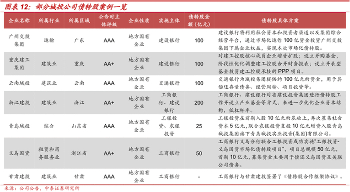 目前债转股的目标企业也逐步从部分强周期产能过剩行业主体拓展至城投公司,大部分城投公司具有杠杆率偏高,盈利能力较弱等问题,债转股能够在一定程度上帮助城投公司去杠杆。此外,针对上市城投公司,债转股实施机构的退出方式也更加多样,更有利于债转股的实施。目前城投公司实施债转股的案例较少,未来在政策助推下可能有所增加。