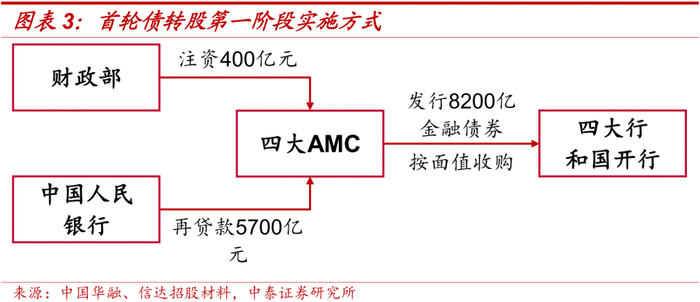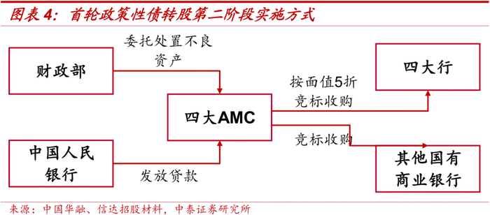1999年政府分别设立信达、东方、长城、华融四大资产管理公司,对口接收和处置来自建行和国开行、中国银行、农行、工行的不良贷款,主要实施方式为先由财政部为四家AMC分别提供100亿元资本金,再担保四大AMC向央行再贷款5700亿元,同时允许四家AMC分别向对口的四大行和国开行发行固定利率为2.25%的8200亿元金融债券,用于按面值收购1.4万亿元的不良资产。