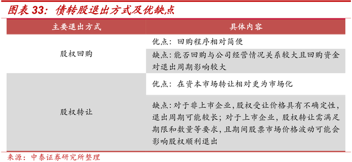 (5)退出方式:由于债转股目标企业以强周期性行业的上市或非上市公司为主,针对上市公司,IPO、并购重组等方式流程较为复杂,退出周期可能被拉长;针对非上市公司,如新三板转让股权等退出方式并不完善,且债转股的目标企业大多经营情况较差,实操中再通过上市退出难度较大。