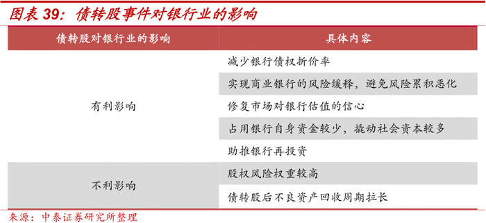 债转股能够带给商业银行较多有利影响,一是由银行或与银行存在利益关联的主体承接债转股,可以减少银行债权的折价问题;二是债转股在实现企业债务重组同时化解优质实体经济困难,实现商业银行的风险缓释,避免风险累积恶化[1];三是市场化债转股有利于修复市场对银行估值的信心;四是银行以基金模式进行债转股,实际对银行自身资金占用较小,而撬动社会资本较多。五是助推银行再投资,2018年6月央行定向降准释放资金推动市场化债转股进程,叠加债转股成功回收资金的可能性,或可释放银行可投资金。但商业银行进行债转股也存在股权风险权重较高、债转股后不良资产回收周期拉长等问题。