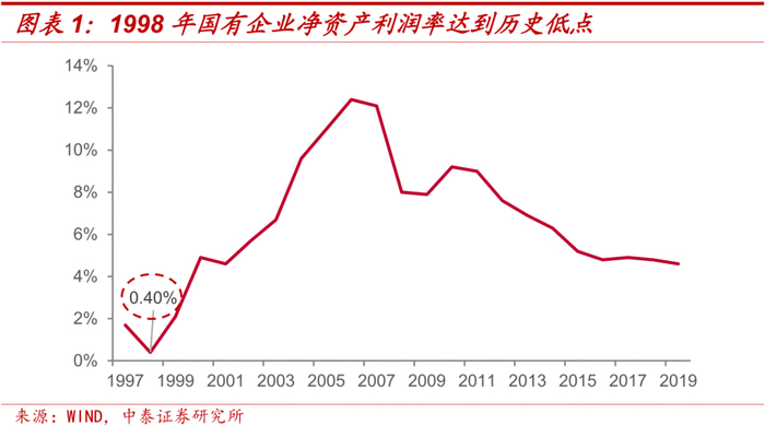 我国在1997年亚洲金融危机后经济面临下行压力,为应对危机政府采取了一系列宽松政策,如取消对国有商业银行信贷规模限制、降低银行准备金率等,由于当时银行对贷款的甄别和监督措施尚未完善,这些措施造成商业银行不良贷款率不断攀升,银行体系风险加剧。此外由于经济紧缩,国有企业的亏损情况也愈加沉重,1998年全国国有企业净资产利润率达到历史最低,仅为0.4%。