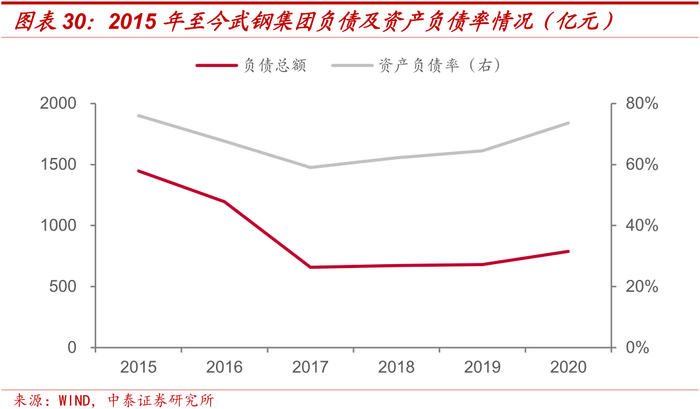 截至2015年末,武钢集团总负债为1446.84亿元,资产负债率为76.04%,在债转股实施后,集团的负债总额和资产负债率显著下降,截至2017年末,武钢集团总负债和资产负债率分别为656.91亿元和59.02%,资产负债率已明显低于钢铁行业中位数66.01%,债转股效果显著。