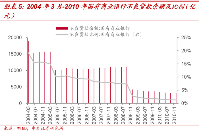为了进一步降低商业银行不良贷款率,帮助国有商业银行改制上市,2004年3月首轮政策性债转股的第二阶段正式开始,四大AMC除了以竞标方式按面值5折收购四大银行的不良资产外,也开始对其他银行的不良资产开展收购。经过第二次大规模剥离,国有商业银行不良贷款比例显著降低,2005年-2010年间国有四大商业银行成功改制上市。