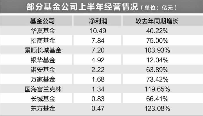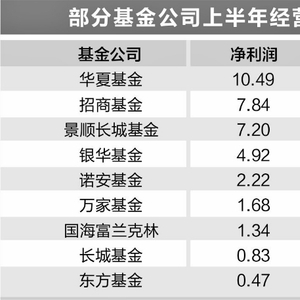 上市公司半年报密集披露,更多基金公司经营情况浮出水面。在已披露相关数据的18家基金公司中,净利润超过1亿元的有9家。大型基金公司喜报连连,华夏基金上半年净利润突破10亿元大关,管理规模也创出1.7万亿元的历史新高;招商基金、景顺长城基金净利润分别达到7.84亿元、7.2亿元,景顺长城净利润同比猛增近104%。
