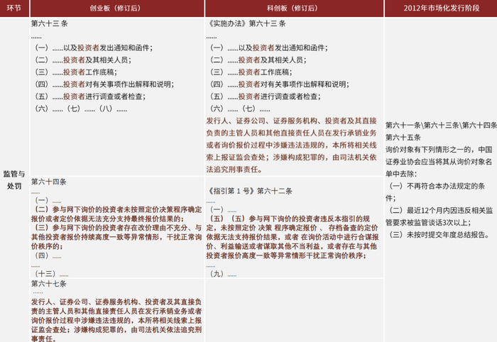 图表:科创板&创业板新股发行规则主要修订条款与2012年市场化发行阶段对比(监管与处罚)
