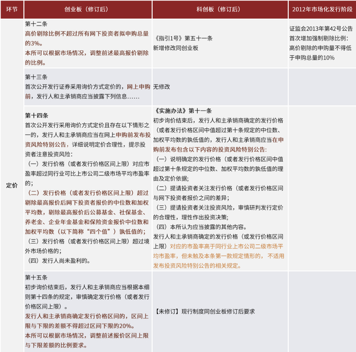 图表:科创板&创业板新股发行规则主要修订条款与2012年市场化发行阶段对比(询价)