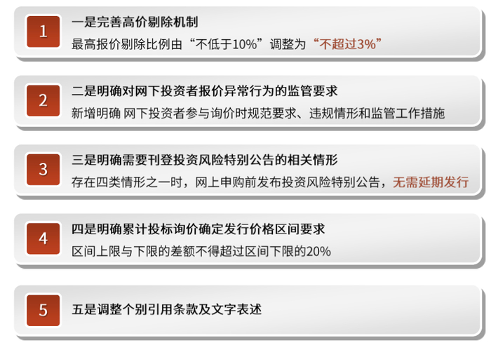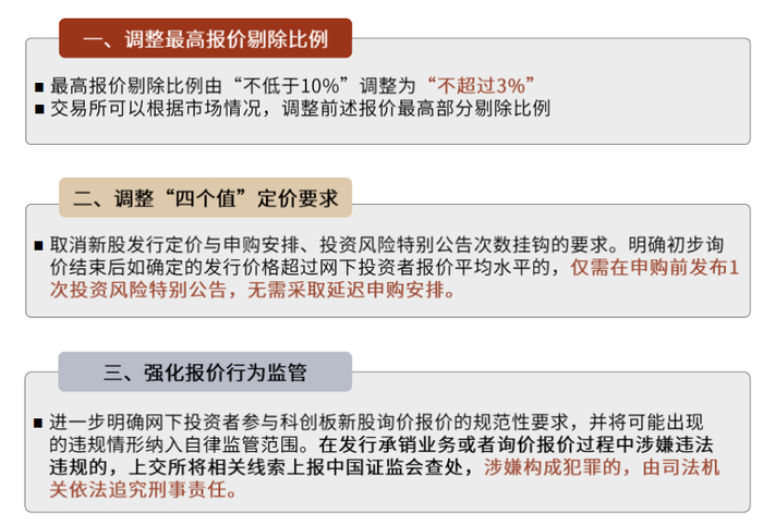 综合沪深交易所的修订内容来看,主要集中于解决“抱团报价”问题的询价、定价和监管处罚等环节。梳理两所的修订内容细节,本次优化调整有三个核心要点: