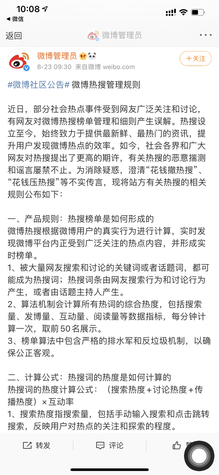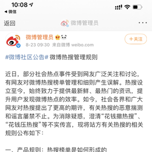 新浪微博公布热搜管理规则,澄清“花钱撤热搜”等不实传言
