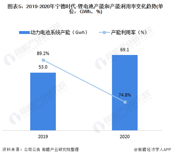 2019-2020年,受益于公司持续的项目投入,宁德时代动力电池的产能有较大的提升,截至2020年末,宁德时代的产能达69.1GWh。在产能利用率方面,2019-2020年,宁德时代动力电池系统的产能利用率从89.2%下滑至74.8%,同比下降14.4个百分点。