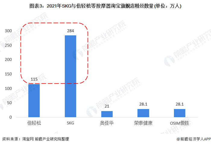 截至2021年7月,SKG的淘宝旗舰店粉丝数量为284万人,倍轻松的淘宝旗舰店粉丝数量为115万人,两者粉丝数量远超其他按摩器品牌。奥佳华旗舰店(包括子品牌轻松伴侣)粉丝数量为21万人;荣泰健康与OSIM淘宝旗舰店粉丝数量都为28.1万人。目前,SKG与倍轻松在国内的品牌知名度均较高。