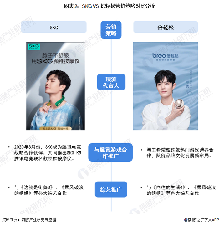 SKG与倍轻松在品牌代言人方面,都选择了人气相当的娱乐圈顶流明星。其中,SKG的品牌代言人是王一博,倍轻松的全球品牌代言为肖战;两个品牌代言人的选择体现了该两个品牌的主要目标群体为当代年轻人,宣传能够触达粉丝和精准用户。