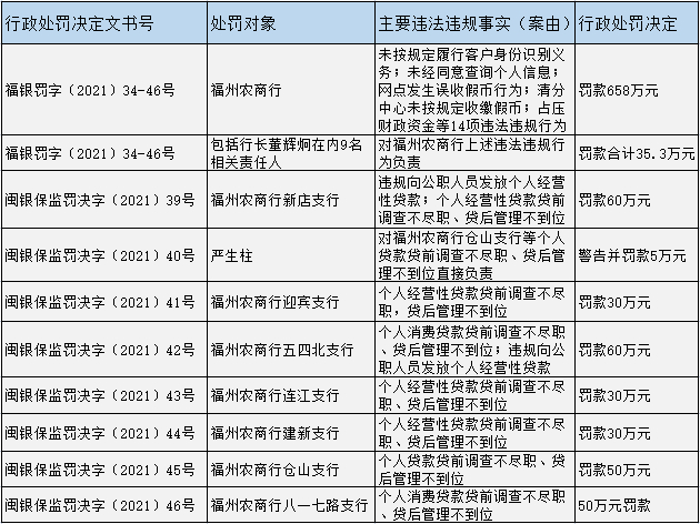 8月13日,福州农商行因未按规定履行客户身份识别义务等14项违规违法行为被央行福州中心支行罚款658万元。此前,8月6日,该行7家支行因消费贷、经营贷违规被罚款,合计达310万元。
