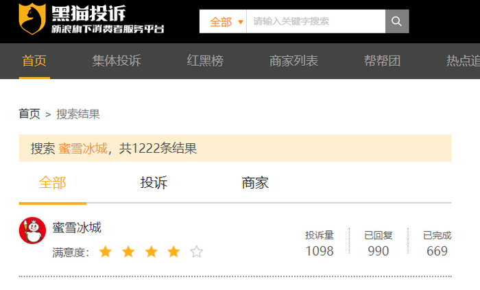 在黑猫投诉平台上,涉及蜜雪冰城的投诉有1098条,多涉及饮品中有异物、有虫等。
