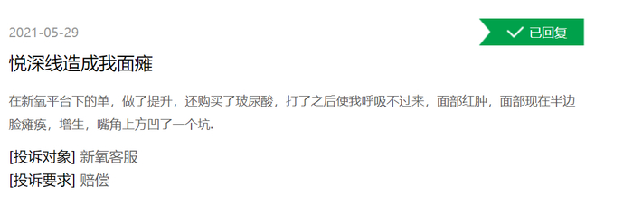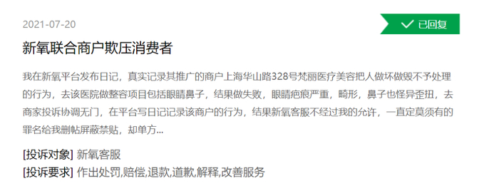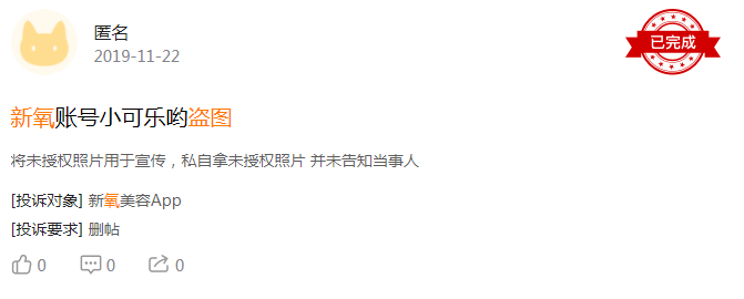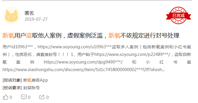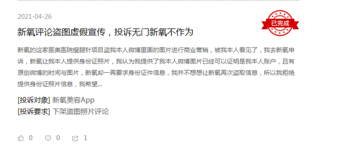 而当帖子里使用的照片不是本人真实分享时,衍生的另一个问题是盗用他人图片,侵犯肖像权。在黑猫投诉平台上,有部分消费者投诉,新氧平台上的医院盗取消费者本人微博里的图片进行商业营销。