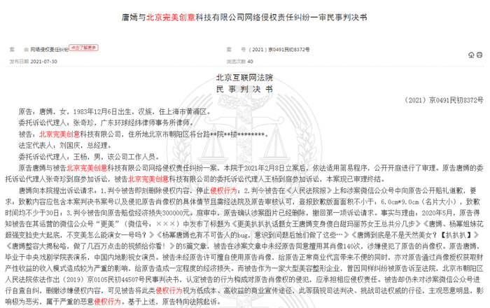 记者浏览了中国裁判文书网上有关事件判决书,发现完美创意的辩词都十分相似,首先坚称“在公众号中引用原告照片的行为不是商业行为,并非以营利为目的,属于公民言论自由的权利范畴”,其次是表示使用照片的行为属于合理使用,并不构成肖像权的侵犯,行为不会给公司带来任何用户量增长的效益