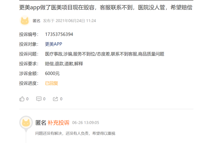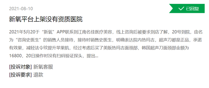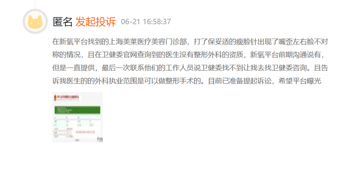 同时,在投诉平台上,有不少求美者倾诉了由于新氧、更美的推荐,导致其毁容的经历。在黑猫投诉上,关于新氧美容的投诉量为246条,其中多数指向新氧APP上的医师、医院存在资质不全、非法行医。