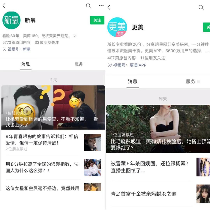 记者浏览了两个线上医美平台的微信公众号后,发现他们发布文章主题大多都以明星八卦为噱头,以美容整形为主题,在文章末尾或开头,总会显示更美小程序的入口,抑或嵌入带有“免费”“千元神秘大礼等你来领”“高性价比”“靠谱”等字眼的营销活动,值得注意的是,这些文章的阅读量时常突破10万次。