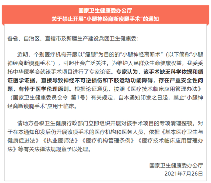 今年5月20日,用于“瘦腿”的“小腿肌肉阻断术”相关话题登上热搜,据了解,该手术的原理是切断小腿神经,使腿部肌肉出现萎缩,从而达到瘦腿的目的。协和整形外科医生肖一丁在自己的科普视频中将“阻断瘦腿”列为“医美七大邪术”之首,并将该手术称为“致残手术”。