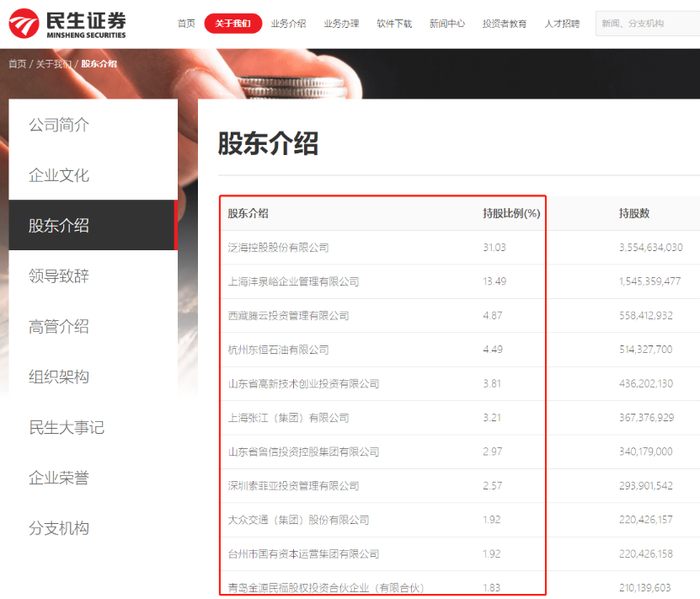 民生证券官网显示,泛海控股目前仍然是第一大股东持有31.03%股份,上海沣泉峪企业管理有限公司持有13.49%股份,其他国有股东还包括山东鲁信投资控股集团等。