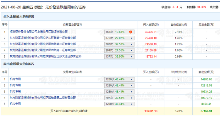 数据显示,该股当天买入前5席位均为游资营业部席位。其中,招商证券上海牡丹江路营业部净买入4.25亿元,此外,东方财富证券在拉萨的4家营业部,合计买入近9.4亿元;该股卖出前5席位中,4家席位均为机构专用席位,合计出逃了4.69亿元。
