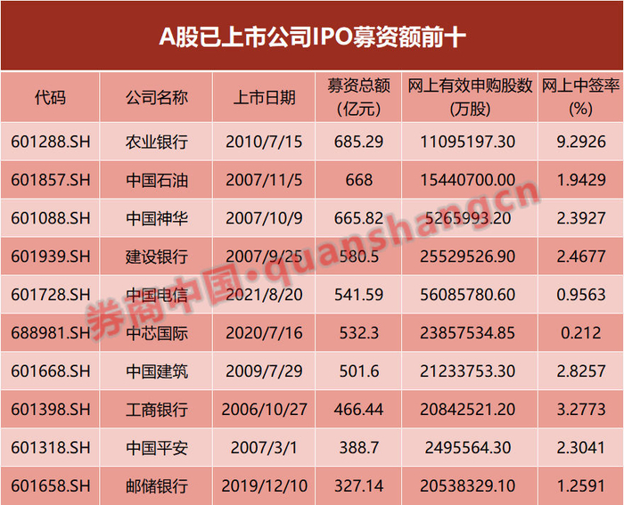 Wind数据显示,中国电信A股发行价为4.53元/股,首发募集资金达541.59亿元,暂处于A股历史上第五大IPO——前四位分别是农业银行、中石油、中国神华和建设银行。值得注意的是,8月18日中国移动回A上市申请获中国证监会受理,拟募集资金560亿元。如果顺利获批,该募资额将超过中国电信,成为历史上第五大IPO。