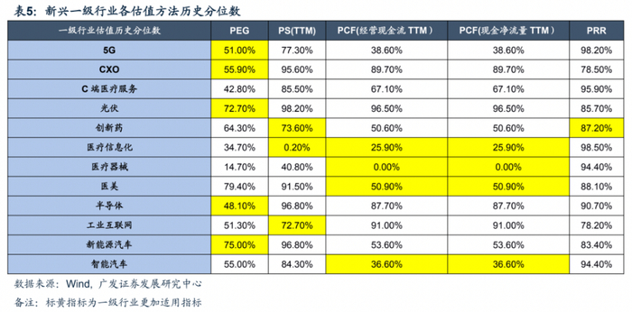 我们重塑新兴产业估值体系,考虑以下几个估值指标:(1)PEG;(2)市销率PS(TTM);(3)市现率PCF(经营现金流TTM);(4)PCF(现金净流量TTM);(5)市研率PRR。