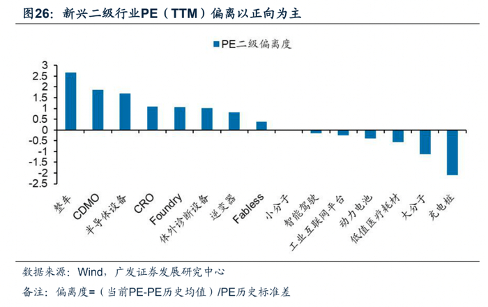 在所有二级行业中,六成行业PE(TTM)估值偏离度为正,其中三成行业偏离度大于1,代表性行业有整车、CDMO、半导体设备、Foundry等;四成行业估值偏离度为负,其中一成行业偏离度小于-1,代表性行业为充电桩、大分子等。
